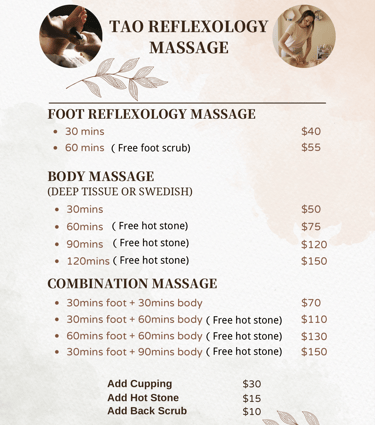 At Tao Reflexology Massage, we specialize in revitalizing foot and body massages, delivered by skilled and professional therapists dedicated to enhancing your well-being and relaxation.